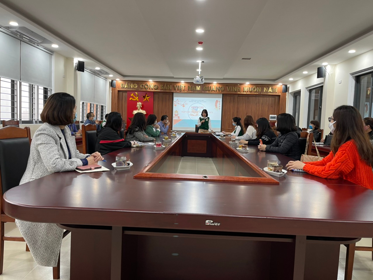 Tiếp theo, cô giáo Trần Thị Phương Dung- Bí thư Chi bộ, HT nhà trường đã thông qua phương hướng, nhiệm vụ trọng tâm trong học kỳ 2, các kế hoạch, kịch bản khi học sinh được đi học trực tiếp và khi tham gia học trực tuyến Online tại nhà.