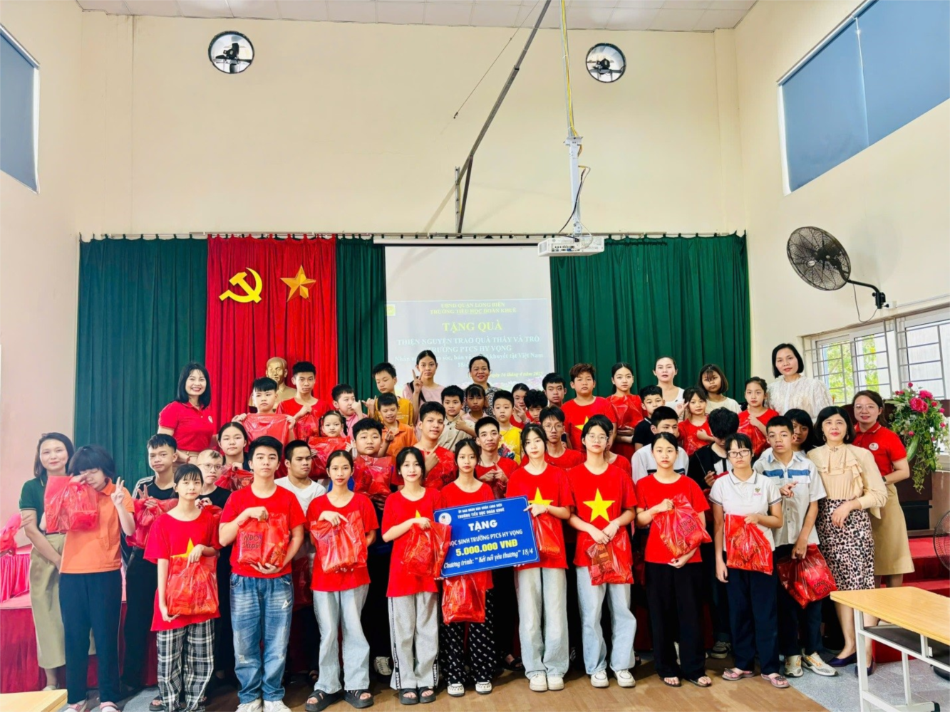 Mở đầu chương trình, cô giáo Hà Thị Diệu Thúy – Phó Hiệu trưởng nhà trường đã đại diện cho tập thể Trường TH Đoàn Khuê trao tặng 5.000.000 đồng tiền mặt cùng 60 suất quà trị giá 1.500.000 đồng dành cho các em học sinh đang học tại trường PTCS Hy Vọng.