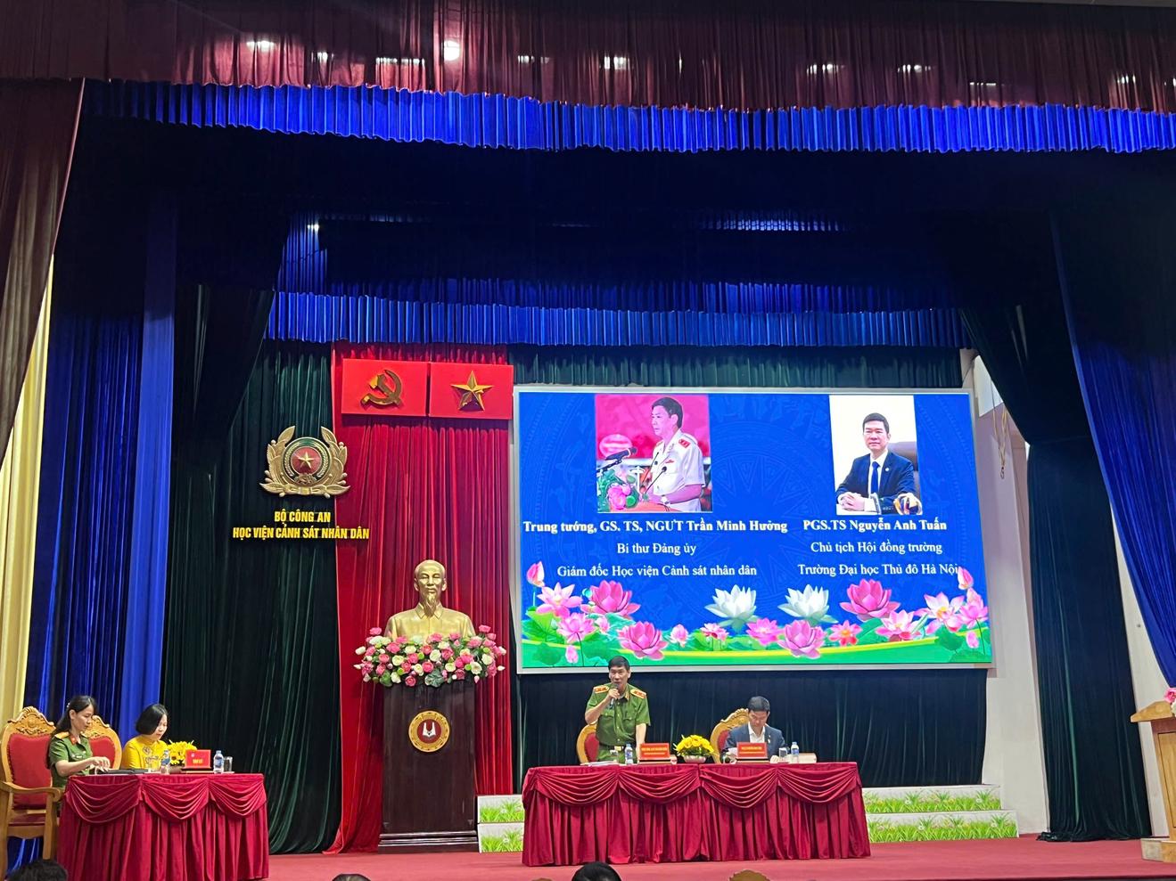 (Thanh tra) - Chiều 12/5, Trường Đại học Thủ đô Hà Nội và Học viện Cảnh sát Nhân dân đã phối hợp tổ chức Hội thảo khoa học quốc gia với chủ đề “Giáo dục Quyền con người ở các nhà trường trong kỷ nguyên vươn mình của dân tộc”. Trung tướng, GS. TS, NGƯT Trần Minh Hưởng - Giám đốc Học viện Cảnh sát Nhân dân và PGS. TS Nguyễn Anh Tuấn - Chủ tịch Hội đồng trường Đại học Thủ đô Hà Nội chủ trì hội thảo.