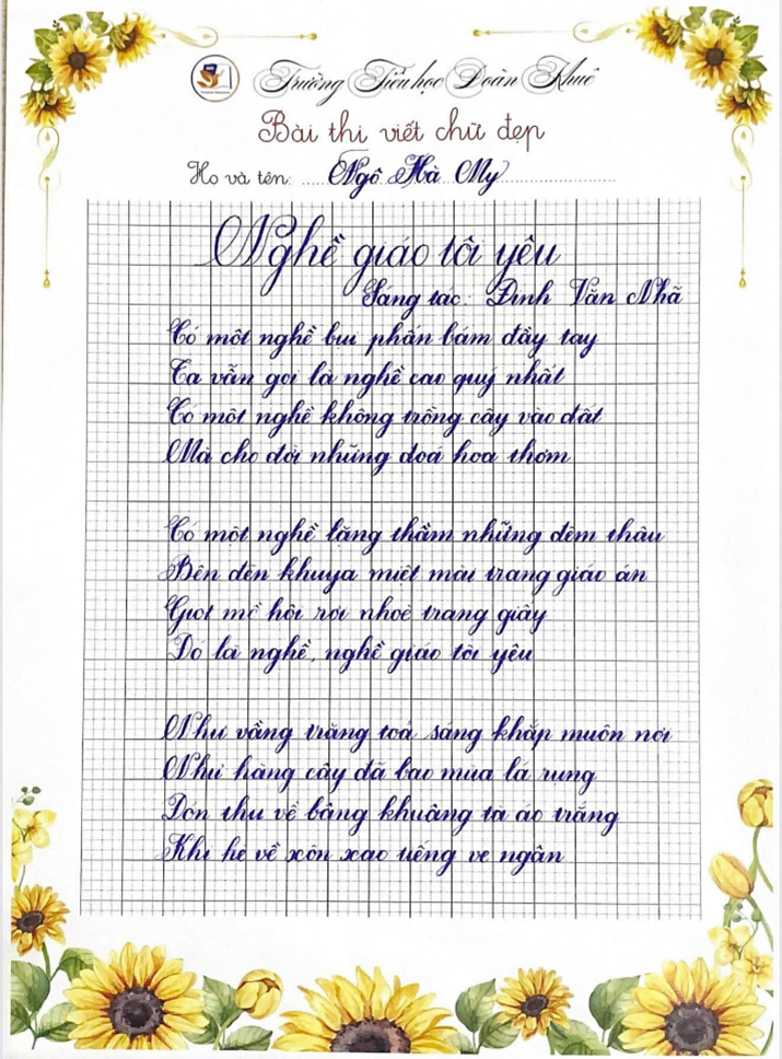 Tham gia hội thi, các giáo viên đã trình bày bài viết trên giấy ô ly với nét chữ mềm mại, rõ ràng, đều đặn và sáng tạo. Ban giám khảo đánh giá cao tinh thần, thái độ nghiêm túc và sự đầu tư của các thí sinh.