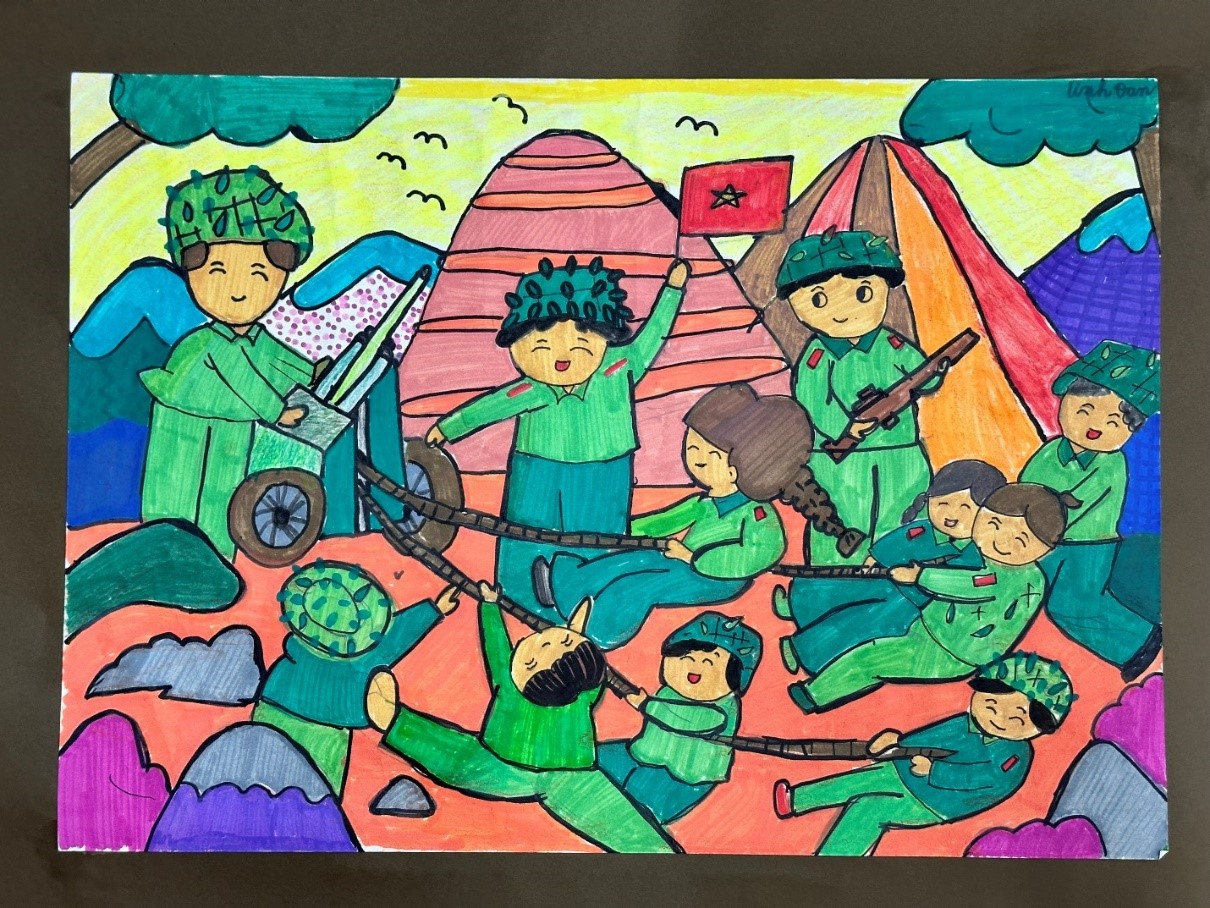 Nhằm tăng cường tuyên truyền, nâng cao nhận thức cho thiếu niên, nhi đồng về ý nghĩa của chiến thắng Điện Biên Phủ (07/5/1954 - 07/5/2024) đối với lịch sử đấu tranh giải phóng dân tộc của nhân dân Việt Nam đồng thời giáo dục truyền thống yêu nước, tinh thần tự hào dân tộc, lòng biết ơn đối với các anh hùng, liệt sỹ đã hy sinh vì sự nghiệp giải phóng dân tộc; vì độc lập, tự do và hạnh phúc của nhân dân, học sinh Trường Tiểu học Đoàn Khuê đã tham gia cuộc thi “Vẽ tranh của thiếu niên, nhi đồng về Chiến thắng Điện Biên phủ và hình ảnh Điện Biên phủ hôm nay”. Tranh dự thi của các bạn học sinh đã tái hiện chiến thắng lịch sử Điện Biên Phủ (07/5/1954 - 07/5/2024); ca ngợi chiến thắng lịch sử Điện Biên Phủ; vẻ đẹp thiên nhiên, con người, văn hóa, lịch sử của Điện Biên; thể hiện cảm xúc, suy nghĩ về những đổi thay của Điện Biên hôm nay.