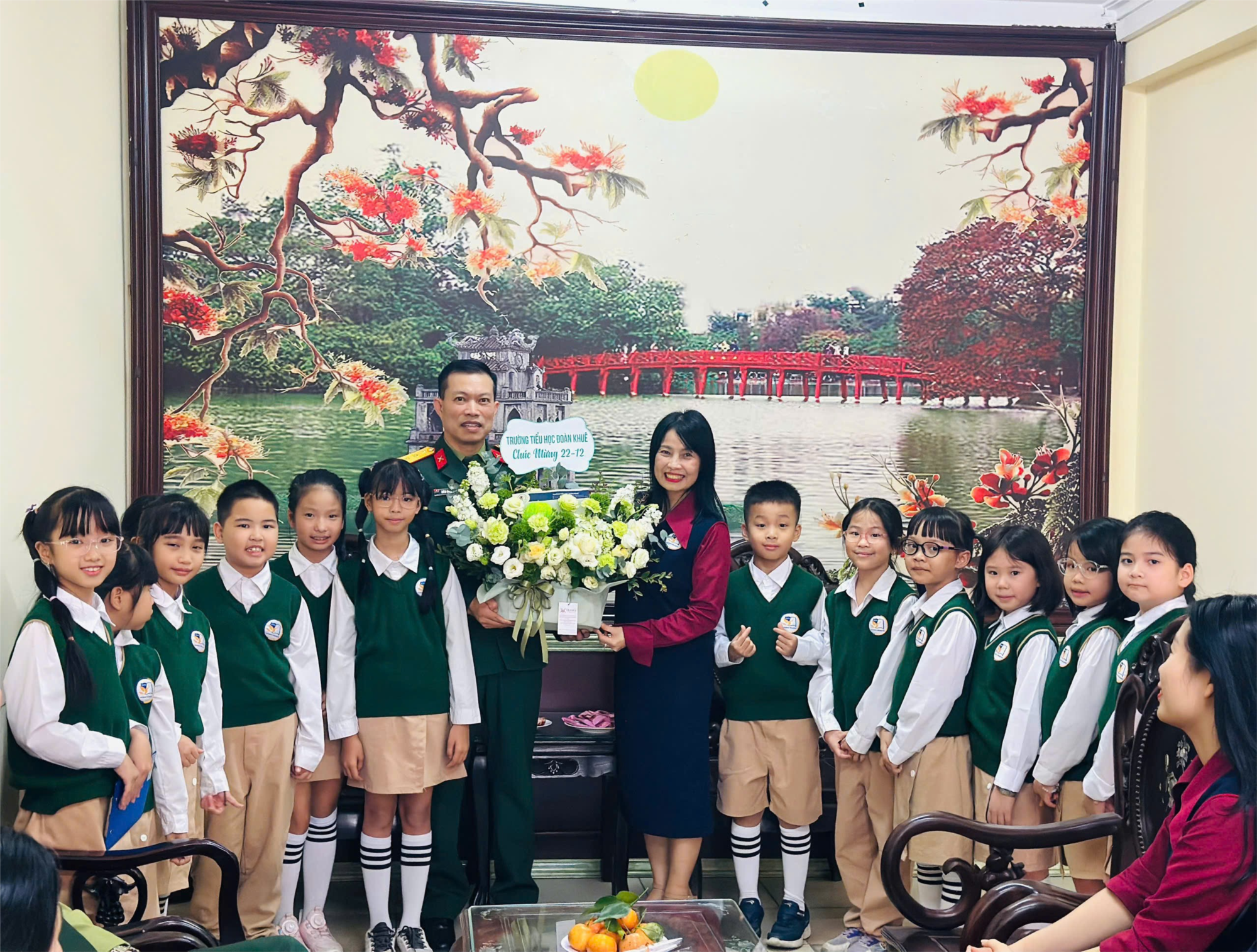 Đại diện BGH nhà trường cùng các bạn HS tiêu biểu Khối 3 có lẵng hoa tươi chúc mừng Đơn bị Kết nghĩa – Đoàn 871 nhân ngày 22/12