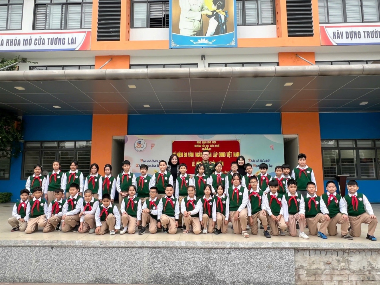 Các bạn Đội viên mới đã vinh dự được bác Thượng tá Diêm Công Thành – Chính trị viên Hệ tập huấn Đoàn 871, cô Trần Thị Phương Dung – Hiệu trưởng nhà trường, cùng các cô giáo chủ nhiệm đặt lên vai chiếc khăn quàng đỏ thắm, bắt đầu từ giây phút này các em chính thức trở thành Đội viên Đội TNTP Hồ Chí Minh